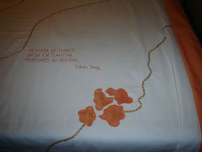 Finalmente, aí está uma foto da colcha confeccionada, e bordada com um haicaizinho meu, pela prendadíssima Maria Thereza!