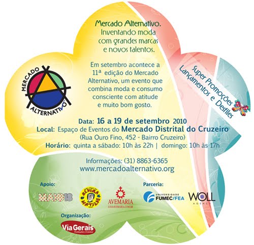 Amigos, aí está o convite para o divertido Mercado Alternativo! Tem roupas, acessórios, comidas, arte e beleza! A Santa Liga, mimos e lingeries, também estará lá… Terá exposição Mulheres Emergentes e, no sábado, dia 18 de setembro, às 11 horas, estaremos nos apresentando poeticamente lá, eu, Tânia Diniz, e minha amiga Lívia Tucci, pela Cia. Poética Estação Platina, e esperamos vocês. No Mercado Distrital do Cruzeiro.