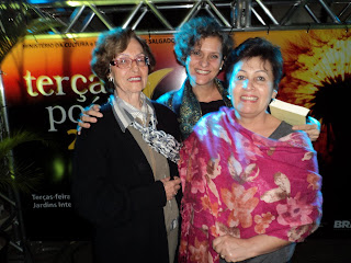 E aqui, em outro dia, no mesmo espaço, a alegria de reencontrar a querida amiga, poeta Cely Vilhena (à esquerda), ao meio, sua filha, conhecida diretora de teatro, Cida Falabella, e eu, Tânia