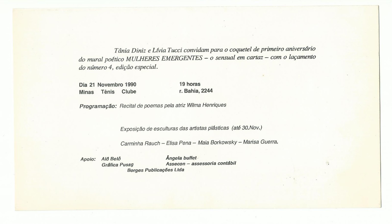 Aqui, o convite para o primeiro aniversário ME no Minas I, rua da Bahia… foi sensacional! Com o piano de Paulo Mendonça, wísque oferecido pelo saudoso amigo José Geraldo Amormino, apresentação de poemas ME pela maravilhosa atriz Wilma Henriques, que festejava – e foi nossa homenageada  – seu 30 anos de carreira e a belíssima exposição das artistas plásticas Elisa Pena (com